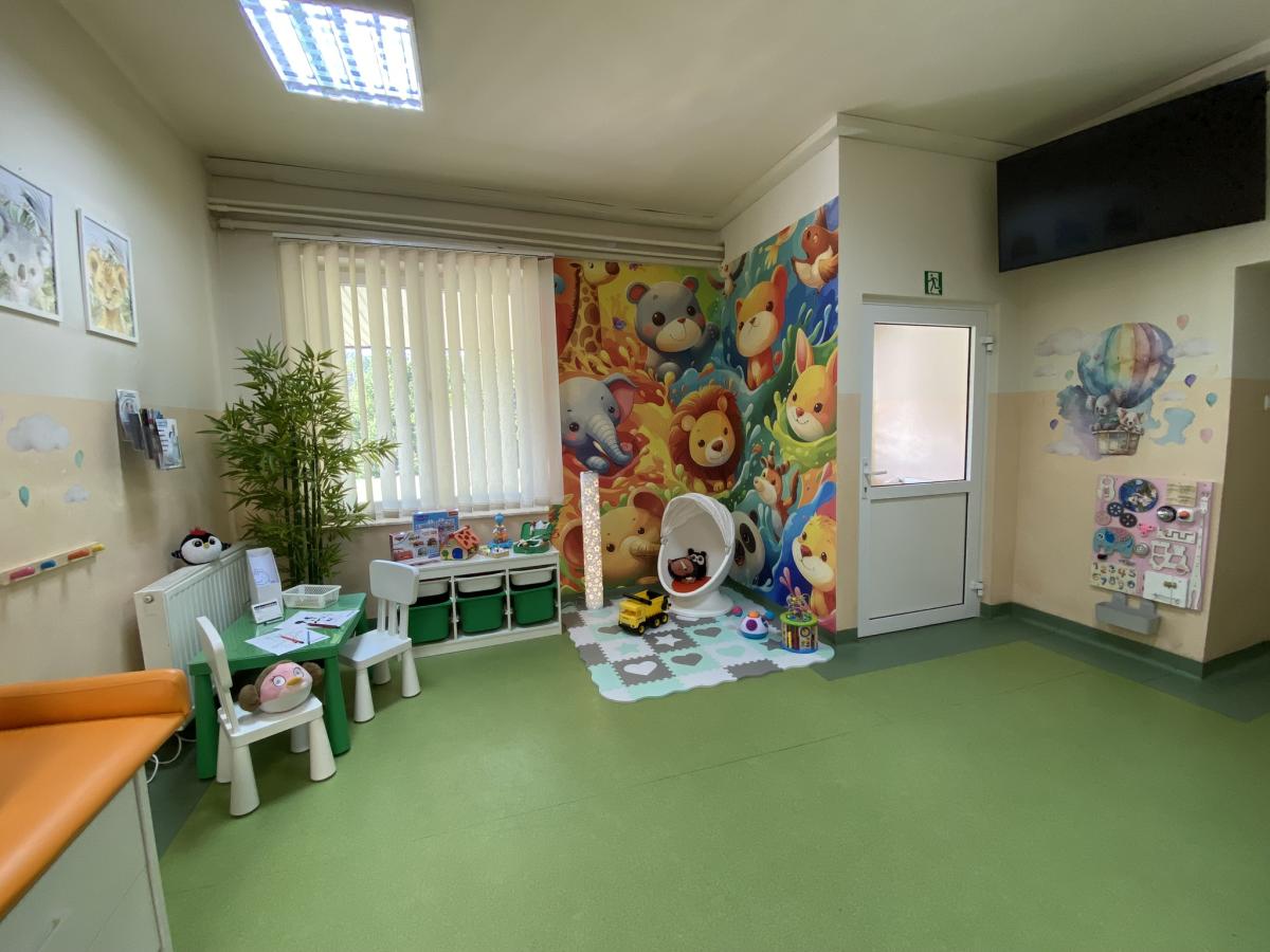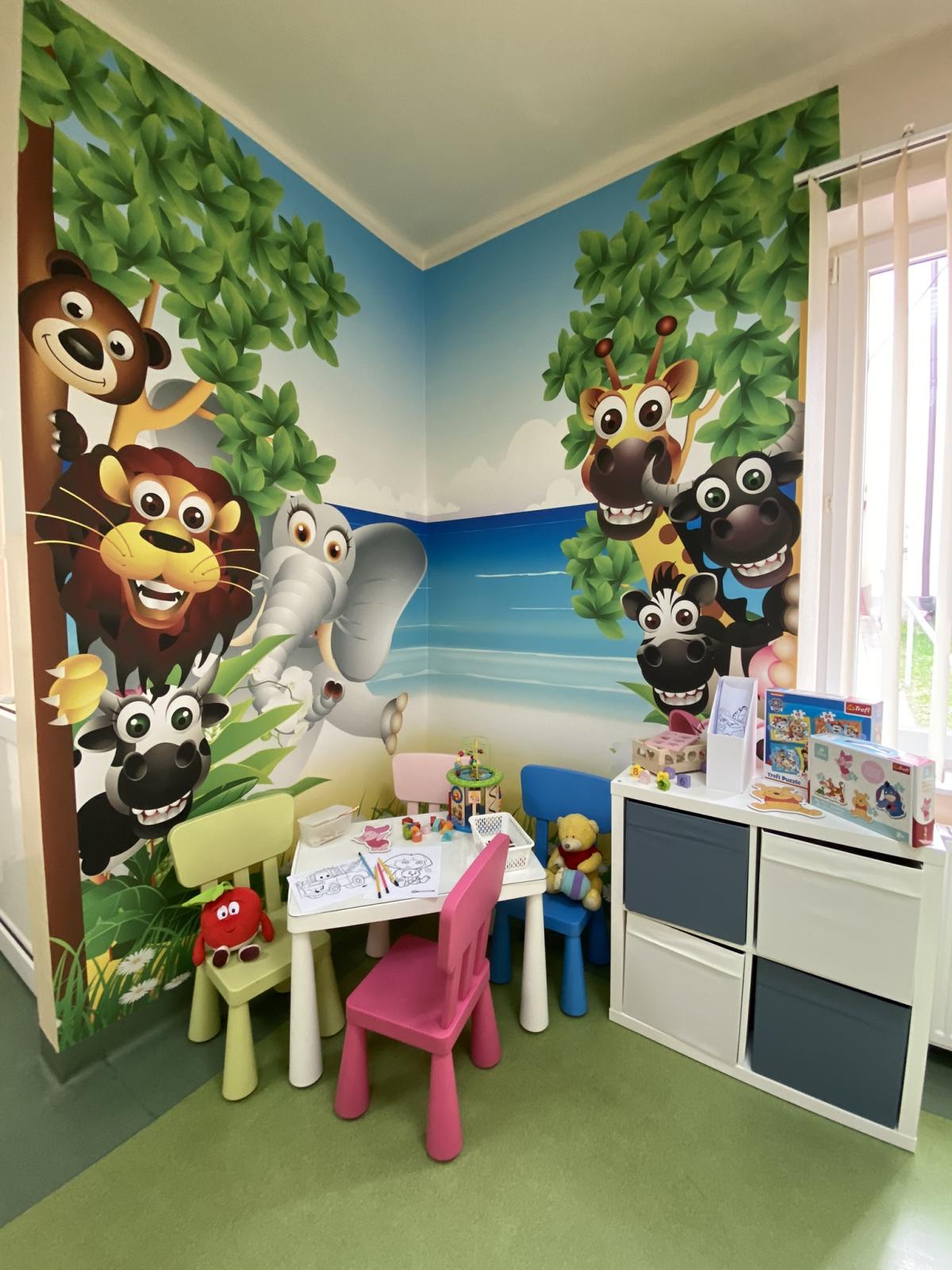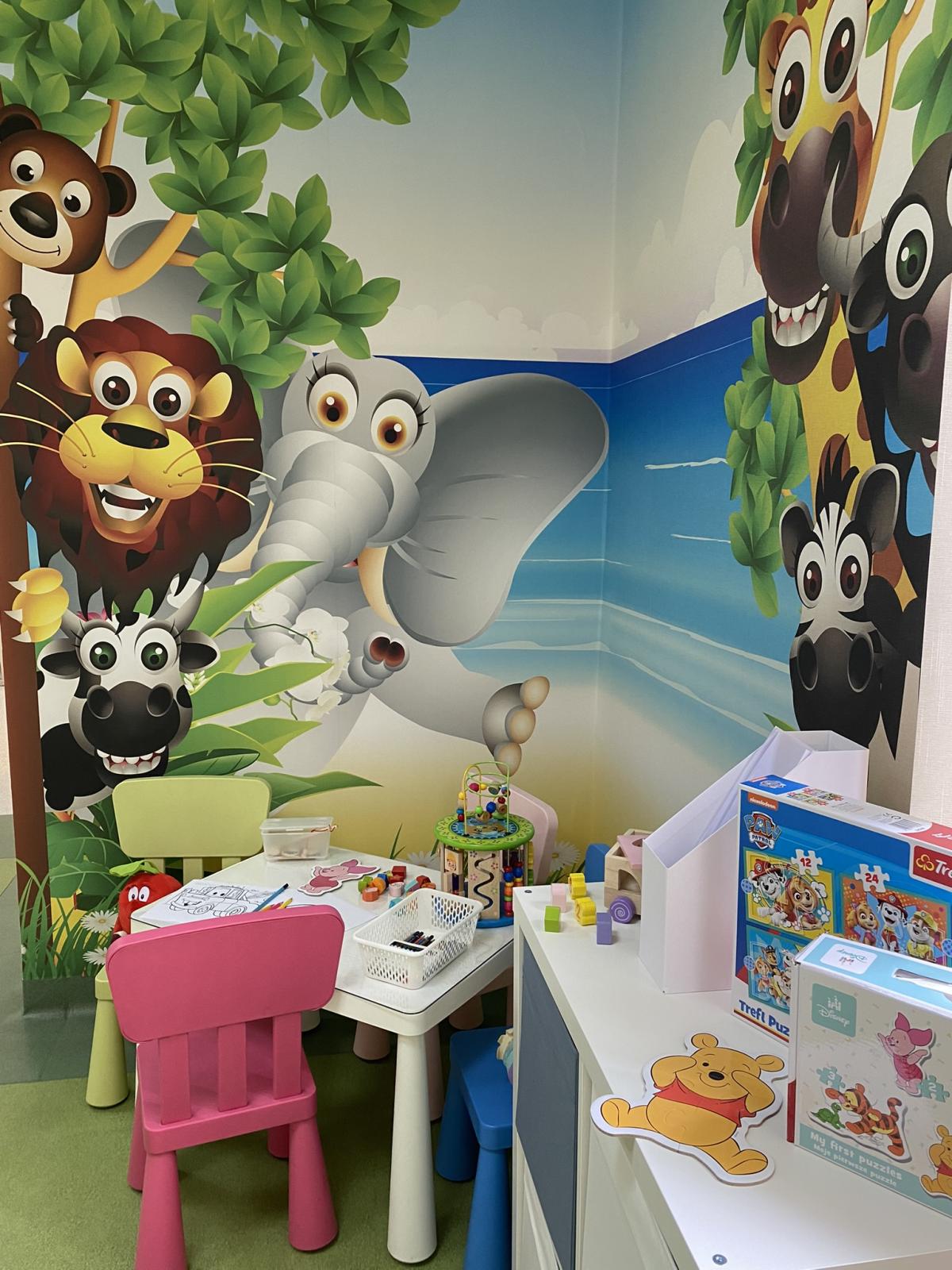 Ściany ozdobione przyjaznymi tapetami ze zwierzątkami tworzą ciepłą, przytulną atmosferę, która pomaga zmniejszyć stres związany z wizytą u lekarza. Kącik został zaprojektowany zgodnie z obowiązującymi standardami bezpieczeństwa i higieny, aby zapewnić dzieciom radosną i bezpieczną zabawę w oczekiwaniu na wizytę.