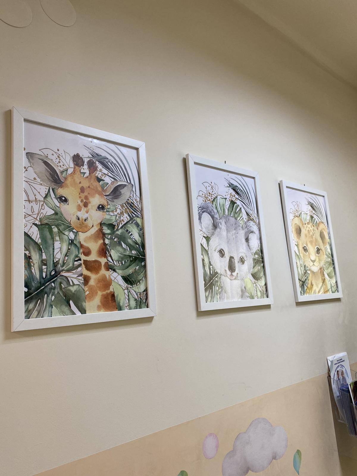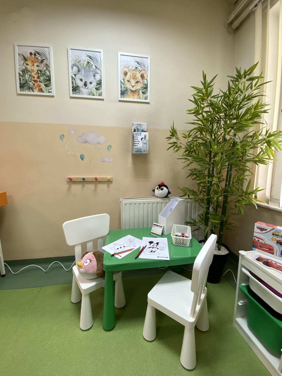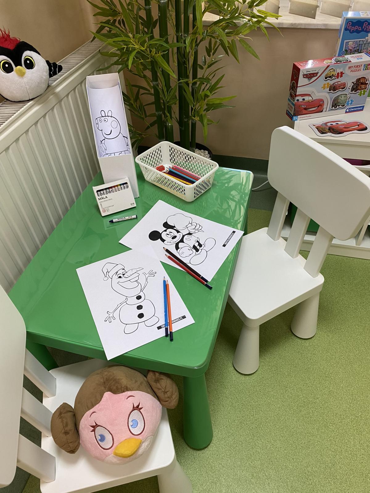 Ściany ozdobione przyjaznymi tapetami ze zwierzątkami tworzą ciepłą, przytulną atmosferę, która pomaga zmniejszyć stres związany z wizytą u lekarza. Kącik został zaprojektowany zgodnie z obowiązującymi standardami bezpieczeństwa i higieny, aby zapewnić dzieciom radosną i bezpieczną zabawę w oczekiwaniu na wizytę.
